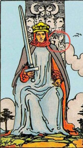 Hier der König der Schwerter. Ich habe mich in letzter Zeit auch wieder intensiv mit dieser Karte beschäftigt und da ist mir etwas aufgefallen, was mir in über 20 Jahren nicht aufgefallen ist. Nämlich hier diese Elfe.